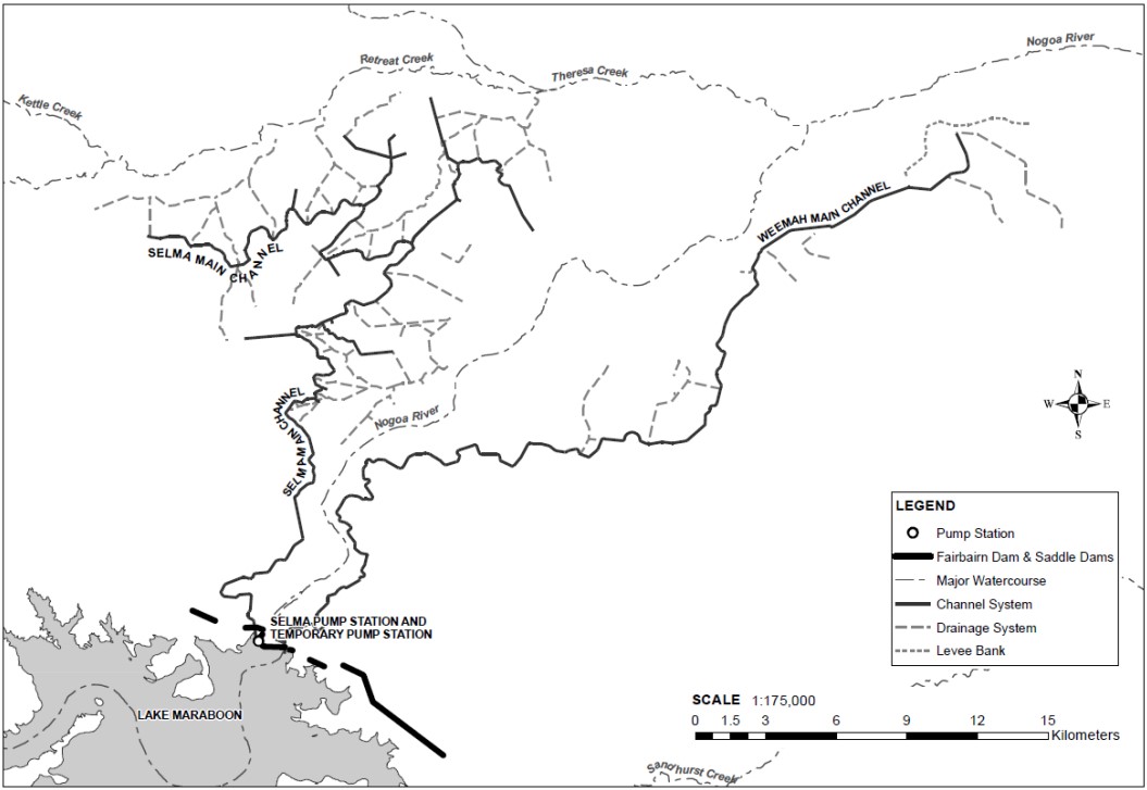 The Weemah and Selma irrigation channels, near Emerald, Qld. Map from a 2019 operations manual published by the Queensland Department of Natural Resources and Mines.